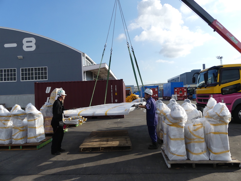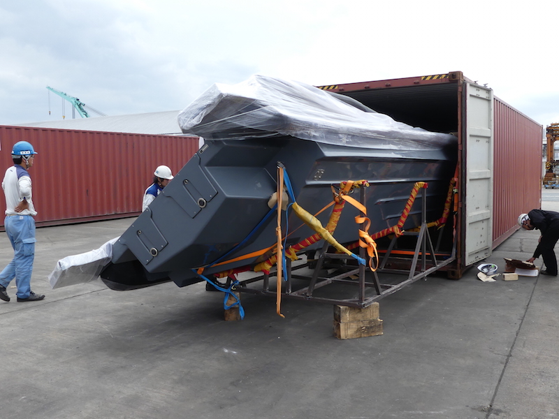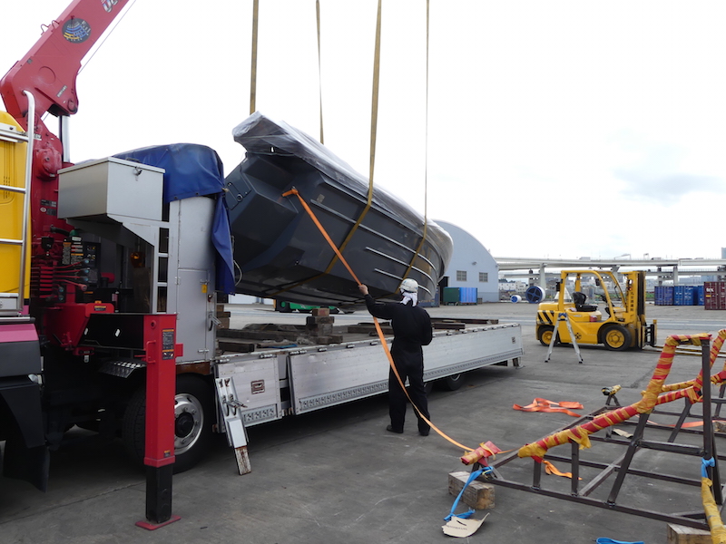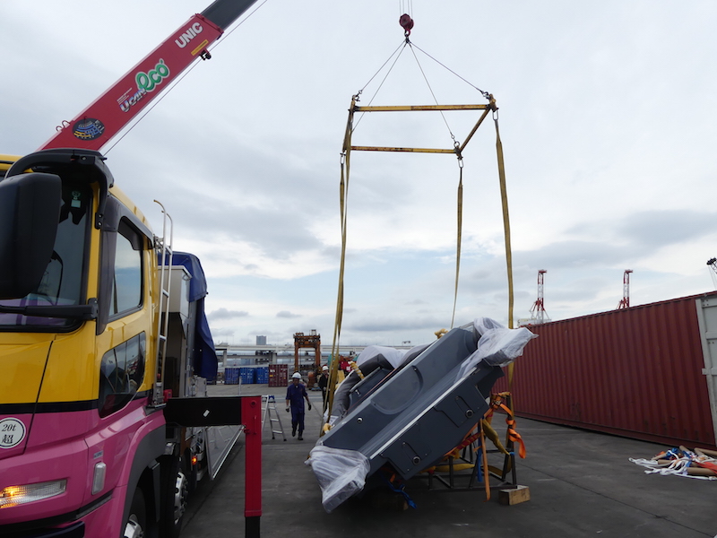 40フィート・ドライコンテナに斜めに入れて到着です。通常なら40フィート・フラットコンテナでの輸送となりますが、ドライ・コンテナですと海上輸送費、本牧でのデバン費はかなり安価となります。其の為にシート、コンソール、T−topは日本での設置となりました。