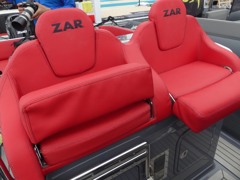 今までのZARと比べ、大幅にグレードアップしたZAR85SLは、バウとスタンにラグジュアリーなコの字型ソファとテーブルが用意され、冷蔵庫2台、シンク、クックバーナー、シャワーを装備。